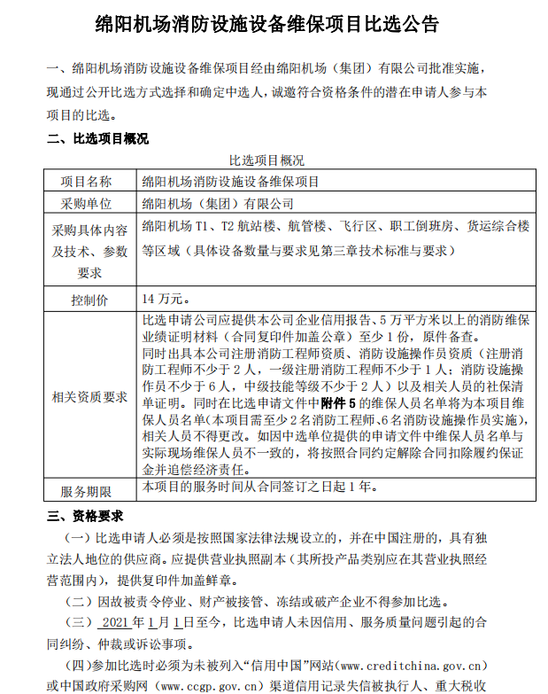 綿陽機(jī)場消防設(shè)施設(shè)備維保項(xiàng)目比選公告