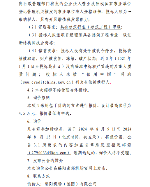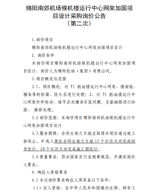 綿陽南郊機(jī)場(chǎng)候機(jī)樓運(yùn)行中心網(wǎng)架加固項(xiàng)目設(shè)計(jì)采購詢價(jià)公告(第二次)