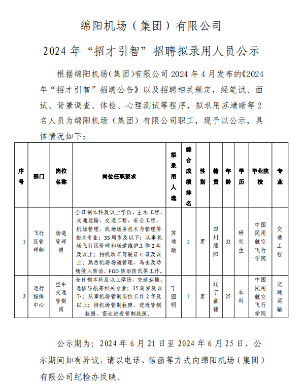 綿陽(yáng)機(jī)場(chǎng)(集團(tuán))有限公司 2024 年“招才引智”招聘擬錄用人員公示